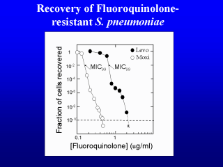 | Shown is a repeat of an earlier slide to allow us to make another point. We isolated colonies from various points along these curves, which were generated for moxifloxacin and levofloxacin with S. pneumoniae. We then determined the nucleotide sequences of the QRDR (quinolone-resistance-determining regions) for the gyrA, gyrB, parC, and parE genes. The results, shown in the next slide, illustrate differences between the two target genes. |