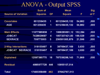 Como vemos, DF es siempre igual al número de categorías menos una. La media de cuadrados (MS o mean square) es el cociente entre cada suma de cuadrados (SS) y su DF. El valor de F es el cociente entre cada MS y el valor de MS de los residuos. Cuanto más elevado, más importancia tiene ese factor en el modelo considerado. La significación se calcula a partir del estadístico F mediante tablas de Snédecor con DF grados de libertad. En este ejemplo, todos los factores y covariables son significativos, indicando que todos estos elementos influyen en el modelo final y por tanto en el salario de los individuos. |