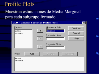 Un gráficos de perfiles de un factor muestra si las medias marginales estimadas aumentan o disminuyen entre niveles. Para dos o más factores, las lineas paralelas indican que no existe interacción entre los factores, loo que significa que puedes investigar los niveles de un solo factor. Las lineas no paralelas indican que existe interacción entre los factores. |