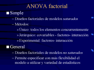 Los modelos saturados son aquellos en los que todas las variables se incluyen en el modelo. Los factores y las covariables así como sus interacciones pueden entrar en el modelo de forma simultánea (modelo único) o bien en distinto orden. Los modelos no-saturados son más complejos. En ellos se eligen las variables a incorporar al modelo, bien manualmente o de forma aleatoria. Requieren conocimientos de estadística avanzada para tomar las decisiones más adecuadas. |
