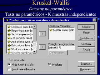 Este procedimiento compara dos o mas grupos de casos, definidos en la variable de agrupación, respecto a una variable dependiente definida en la casilla contrastar variables. Ejemplo: ¿Difieren tres marcas de bombillas de 100 watios en su tiempo de vida media? Con el test de Kruskal-Wallis puede detectarse que las tres marcas ciertamente difieren de su vida media útil. Hay tres tests disponibles: H de Kruskal-Wallis, mediana y Jonckheere-Terpstra.El test H de Kruskal-Wallis, una extension del test U de Mann-Whitney es el análogo no-parametrico del test Oneway y detecta diferencias en la situación de la distribucion. El test de la mediana, que es una prueba más general pero no tan potente, detecta diferencias en la situación y forma de las distribuciones. Ambas pruebas asumen que no hay un ordenamiento a priori de las k poblaciones de las que se han extraido las muestras. Cuando hay una ordenación natural a priori (ascendente o descendente) de las k poblaciones,es preferible usar el test de Jonckheere-Terpstra. Estadísticos disponibles: Media, desviacion estandard, minimo, maximo, numero decasos no-perdidos ycuartiles. |