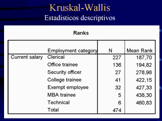 El test de K-W compara el rango medio alcanzado en cada subgrupo con los demás y determina si estas diferencias son suficientemente significativas como para rechazar la hipótesis nula. |