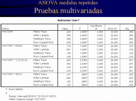 De modo similar a MANOVA, el procedimiento de Medidas Repetidas proporciona análisis uni y multivariados para los datos medidos. Se pueden probar modelos equilibrados y desequilibrados, dependindo de que cada celda del modelo contenga el mismo número de casos o no. En un modelo multivariado, la suma de cuadrados debida a los efectos en el modelo y la SS de errores estan en forma de matriz mas que en la forma escalar encontrada en el análisis multivariado. Estas matrices se denominan SSCP (sums-of-squares and cross-products). Si se especifica más de una variable dependiente se suministra un análisis de varianza multivariado usando la traza de Pillai, Wilks’ lambda, la traza de Hotelling, y el criterio de la mayor raiz de Roy con tests F aproximados, así como un análisis univariado de la varianza para cada variable dependiente. Además de comprobar las hipótesis, el procedimiento Medidas Repetidas produce estimaciones de los parámetros. |