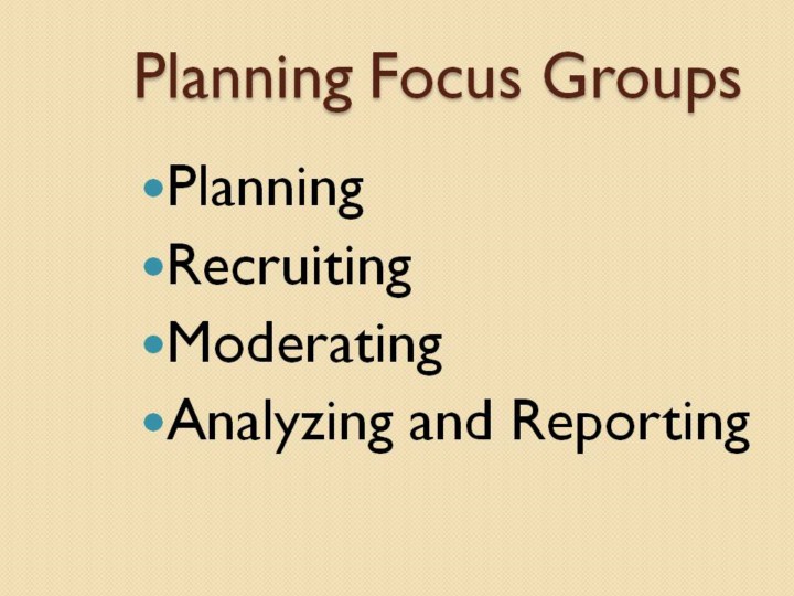 The key to planning focus groups is to think through the whole project. All research projects using focus groups consist of four basic steps: Planning - This is the fundamental first step in any project. If is not done well, everything that follows is of questionable value. Recruiting - Recruiting participants for the focus group can occur in several ways: conducted by the researcher, by volunteers, or by an external group or agency. Moderating - A typical focus group requires at least three hours of time from both the moderator and assistant moderator. Analyzing and Reporting - Focus groups are an open-ended, qualitative method, you cannot predict with considerable accuracy how much effort the analysis will take. |
