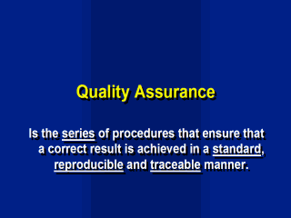 Quality Assurance: Quality Assurance is achieved by a series of processes that assure the most accurate and highest quality result. To achieve high quality results, input from all members of every laboratory in a testing network is required. All laboratory personnel should be aware of the necessity for a quality performance. This requires education throughout the testing system. In some countries Quality Assurance Systems are being imposed because laboratories require accreditation to national or international standards. Quality Assurance makes sure of : Laboratory esteem and creditability |