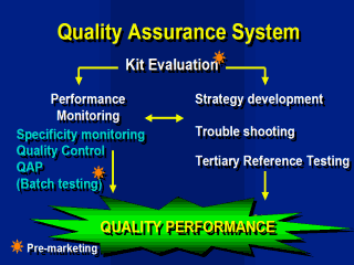 Assurance System: The scheme shows the series of procedures used in quality assurance. The measures of evaluation and batch testing are used prior to marketing (*). They are usually conducted by a centre of reference laboratory with authority to stop the marketing of substandard tests or to publicise the data so that laboratories will know that a test is sub-standard. Functions such as strategy development, trouble shooting and tertiary reference testing are usually carried out in a central reference laboratory. |