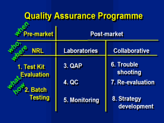 involved in Quality Assurance: Quality may be assessed at different points in time. Broadly, assessments may be made before or after the kit is sold. Pre-market-(before tests can be sold to the laboratories and therefore before the assay is used) To assess the performance of an assay or batch of a kit before release. The initial and formal evaluation of an assay performance is usually a "once off" assessment at a single point in time. Usually only one or two batches are examined. Batch testing may be employed to evaluate all subsequent batches for all assays by using characterised panels eg seroconversion samples. The assay or batch must pass a set criteria before release onto the market Post market-(laboratories are using the assay) This is referred to as ongoing performance monitoring. Batch to batch variability, laboratory problems, operator difficulties, and assay problems contribute to variations in overall assay performances. Ongoing evaluation of assay performance using carefully selected data sets can identify and differentiate these causes of assay variation and is therefore advantageous to the overall quality of laboratory testing. |