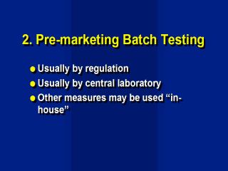 Batch Testing Pre-market batch testing may be regulated by a government e.g. FDA, TGA. Usually a panel of samples is tested in a central laboratory under these circumstances. Other measures such as Quality Control Sample monitoring or reactor rate monitoring may be used but these are often not "pre-market". Laboratories may reserve a panel to test new batches and have an "acceptance contract" that a batch can be refused if the performance is not acceptable. |