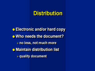 exist electronically, in hard copy, or in both forms. Document control principles apply to both. For hard copies, a list must exist showing where copies are distributed. The Quality Manager must be able to identify the exact number and location of all hard copies, so that all can be changed when a revision occurs. A distribution list is needed for this purpose. Depending on the organisation, different documents usually need to be issued to different people or locations. Sometimes an identified part of a document is issued to a location. For example, a laboratory method may be documented as a work instruction, which includes a flow diagram of the main steps. It would be acceptable, when a new version of the work instruction was issued, to separately produce the flow diagram, laminate it, and display it in the laboratory. Clearly of course, the flow diagram would need to carry the version number and/or date, and be included on the distribution list for copies of work instructions. |