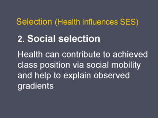 explanation assumes that health influences SES. This means that health can contribute to achieved class position via social mobility and help to explain observed gradients.. But the evidence suggests that this explanation is also of minor importance for explaining inequalities in health. |