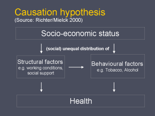 slide gives a more detailed view of the causation hypotheses. First behavioural factors can have an independent effect on health (not dependent on material factors). The structural factors can have two different effects: 1. a direct effect on health and 2. because behaviour is partly embedded in the environment (i.e. material conditions) an indirect effect, through behaviour. |
