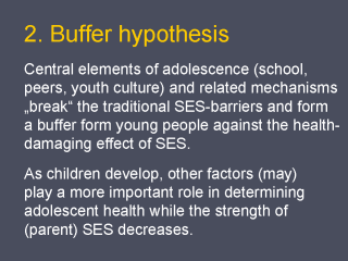 second explanation is the buffer hypothesis According to the buffer hypothesis central elements of adolescence (school, peers, youth culture) and related mechanisms „break“ the traditional SES-barriers and form a buffer form young people against the health-damaging effect of SES. As children develop, other factors (may) play a more important role in determining adolescent health while the strength of (parent) SES decreases. |