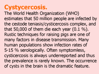 | Anyone handling raw pork or beef might become infected. It is assuredly not a tropical nor a traveler’s disease. Poor management of pigs is a common reason for infection. Of greatest concern is neurocysticercosis (cerebral cysticercosis) which causes seizures, mental disturbances, focal neurologic deficits and intracerebral lesions. |