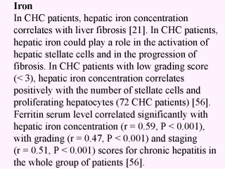 Ferritin levels were positively correlated with AST and GGT levels (68 CHC patients) [57]. Together with serum aminotransferases, but not the pattern of HCV viremia in serum or in liver, they could predict the necroinflammatory activity in liver. However, these authors could not find any other laboratory parameter that was correlated with stage of fibrosis and considered liver biopsy obligatory to assess the disease activity [57]. On the overall, it is not clear whether this correlation merely reflects the presence of more active disease, or iron exacerbates chronic hepatitis C virus (HCV)-induced damage.