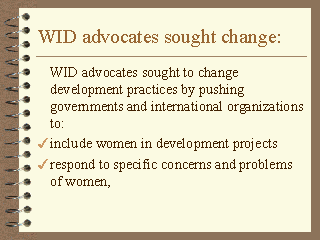 interests of two different groups of women in the 1970s: The UN Commission of the Status of Women And national womens movements, particularly in the US. Some of the specific concerns addressed were Nutrition Health Education Access to resources, such as land and credit These needs are now referred to as practical needs the basics for survival. |