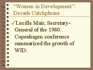 The prospect of steering women from the margin to the mainstream was as exciting to some would-be developers as to female recipients of such policies and programmes. "Women in Development" became the Decades overnight catchphrase, a seductive one, which for a time, at least, could evade the question of what kind of development women were to be drawn into. Quoted by Irene Tinger, |