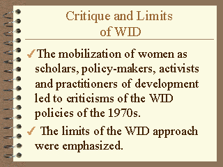 | Limits of WID 1. Accepted traditional liberal economic theory about the nature of development; 2. Assumed women were not already integrated into economic production; 3. Influenced by American feminism: accepted existing social and political structures; 4. Assumed women all had common problems and interests; 5. De-emphasized the family and
