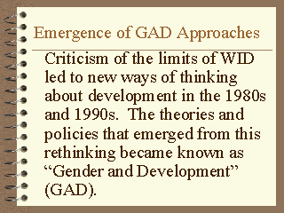 | GAD approaches argued that: 1. Development processes in poor countries or less-developed countries (LDCs) were deeply influenced by the inequitable structures of the international economic system. 2. Women have always been integrated into development processes, but those processes essentially flawed. 3. Men, as well as women, are hurt by development programs that do not alter repressive class, ethnic, and racial structures. 4. One cannot assume womens solidarity across class and racial lines, but patriarchal values and institutions may oppress women in every social-economic category. 5. Development policies should not isolate womens productive or reproductive roles: they are intertwined in womens lives. 6. Women are agents of change and must organize politically. 7. Successful development does not "target" women, it empowers them. |