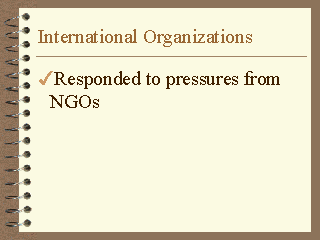 | During the 1990s, international organizations responded to pressure from NGOs and some governments to take new initiatives for improving the status of women. Global conferences contributed to a more powerful recognition of the crucial role of women in sustainable development, environmental issues, and human rights. |
