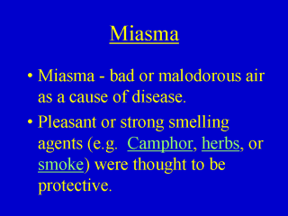 The belief in Miasma led people to try and protect themselves against the disease with substances that would counteract bad smells. The illustrations show people buying camphor, a lady wearing protective clothing covered in sweet smelling herbs and a man smoking a large cigar in order to ward off cholera. |