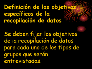marco al análisis de datos. Deberán elaborarse objetivos específicos para cada uno de los tipos de grupos que serán entrevistados. Los objetivos específicos se orientan principalmente hacia las percepciones, creencias y aptitudes de los participantes y no tanto a sus prácticas personales.