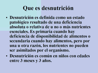clasificada clínicamente en: Marasmo: causada por una dieta deficiente en calorías Kwashiorkor: causado por una dieta primariamente deficiente en proteínas. La pérdida de peso no es muy notoria, debido a que la pérdida es enmascarada por edema. |