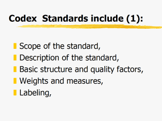 standard, including its correct name i.e. the name of the relevant food, Description of the standard and definition of the product, the basic material from which it is produced, description of the production process and packing, Basic structure and quality factors (minimum standards for the relevant food), Weights and measures, Labeling- according to the Codex general standards for labeling of packed food. The purpose of the name of the standard, the scope, description, weight and labeling is to ensure that the consumers would not be misled and that the characteristics of the product correspond to its declaration. |