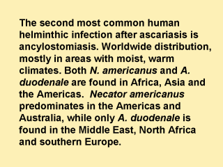 respiratory symptoms can be observed during pulmonary migration of the larvas. Microscopic identification of eggs in the stool is the most common method for diagnosing hookworm infection. The recommended procedure is as follows: 1/ Collect a stool specimen. 2/ Fix the specimen in 10% formalin. 3/ Concentrate using the formalin–ethyl acetate sedimentation technique. 4/ Examine a wet mount of the sediment. Hookworm infections are generally treated with albendazole, mebendazole or pyrantel pamoate. |