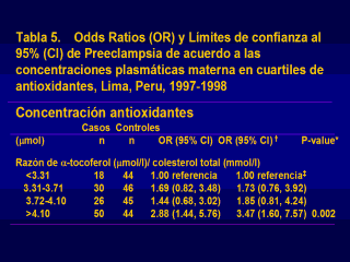 valor de P para la prueba de tendencia linear. † Ajustado para edad materna, nuliparidad, índice de masa corporal (BMI)(cuartil) preembarazo, uso prenatal de vitaminas, edad gestacional a la colección sanguínea, educación, embarazo planeado, y concentración de colesterol total.‡ Ajustado para edad materna, nuliparidad, BMI preembarazo (cuartil), uso prenatal de vitaminas, edad gestacional a la colección sanguínea, educación y embarazo planeado. |