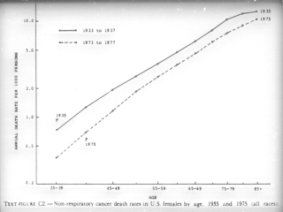| Tasas de mortalidad por cáncer no respiratorio en Estados Unidos de NorteAMérica, mujeres por edad 1935 (arriba) 1975 |
