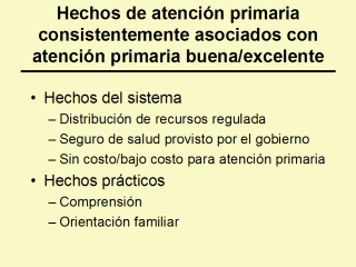 | Hay 5 carac son características que distinguen mejor la atención primaria de los países con pobre atención primaria. 3 de las 5 son características del sistema, y dos son características de la práctica. |