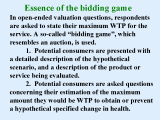 | A first bid is made to the respondent, who accepts or rejects it. Then the bid is raised or lowered depending on the respondent’s answer. The process goes on until the respondent’s maximum WTP is reached. It is important not to frustrate or bore respondents with a lengthy bidding game. Bidding was best when they were allowed only three bids. |