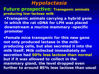 • Hence, if applied to dairy cattle, this could allow the easy and efficient production of low-lactose milk to fulfill the requirements of lactose maldigesters, because a 50–70% decrease in lactose is sufficient to prevent intestinal disorders after milk ingestion.