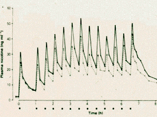 Plasma nicotine concentrations of one subject when smoking high (2,4 mg) and low (0,6 mg) nicotine cigarettes. The smoking period for each cigarette was restricted to 5 min.