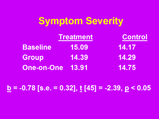 | Findings reflecting the cumulative effect of the combined (group and one-on-one) program for the first year of the study also suggest that the program led to reduced symptom severity for individuals in the immediate treatment condition (as compared to the delayed treatment controls waiting to receive the program). |