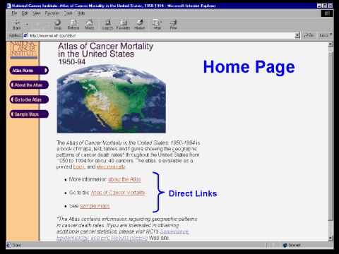 There are currently three links from the Home Page. About the Atlas takes the user to a page containing links to the press release (8 December 1999), Q and A (answers to questions about the Atlas), and research contributions (from earlier atlases). Go to the Atlas links to another page that gives the user information about the book and how to order it, and provides links to the two Web sites Sample Maps takes the user to a page displaying several typical Atlas maps |
