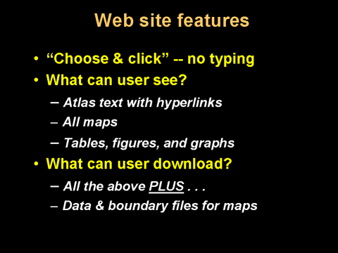 Everything on this Web site can be accomplished through mouse clicks. The user can view all the text, maps, tables, figures, and graphs contained in the Atlas. The user can also download maps, figures, data, and geographic boundary files used to create the maps. |
