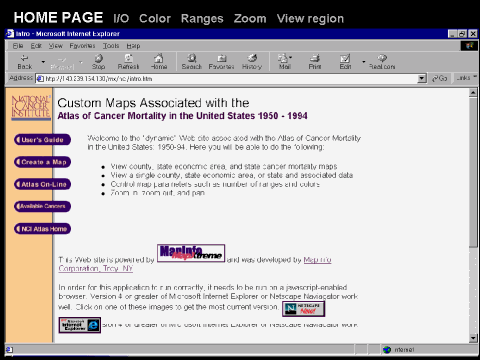The "Customizable Maps" Home page has links to an on-line user’s guide, the "Atlas On-Line" Web site, and a table displaying the cancer/geography/time map possibilities. |