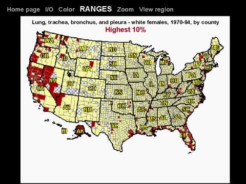 This is the same map as the previous one but with only 2 ranges -- the highest 10% displayed in dark red and the remaining 90% displayed in yellow. |