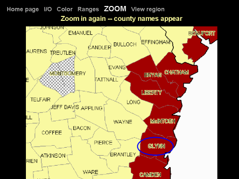 At this point county names are displayed. (Sometimes the name of a small county will not be displayed due to space limitation. It will most likely be displayed on the next zoom, when the county gets "bigger"). Let’s zoom in on Glynn County, Georgia . . .