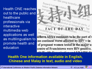 Health ONE is one of a few truly multilingual health portals in the world, with information available in English, Chinese and Malay. As a premier health portal on the broadband Singapore ONE network, it also provides services in audio and video formats. |
