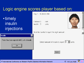 The game’s logic engine scores the player based on (1) timely insulin injections.