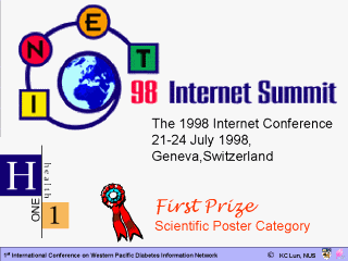 | The multilingual approach to the delivery of health information on the World Wide Web earned Health ONE first prize in the scientific poster category at INET 98, the Internet Conference held in Geneva, Switzerland. |