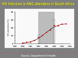 Explosive spread of HIV - 1994-1998 The period 1994-1998 is the most critical period in the evolving HIV epidemic in South Africa. This period marks the explosive growth in HIV transmission fuelled by high incidence rates in young women and the coalescence of genetically diverse epidemics. Ironically this period coincided with the establishment of democracy in South Africa. |
