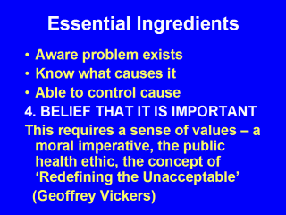 4. The belief (sense of values) that the problem is important: This is an essential prerequisite to determination to do something about it. It is the most fascinating and challenging aspect of the essential features. It is the moral imperative that drives public health reforms. Geoffrey Vickers described the history of public health as a process of redefining the unacceptable – an endless process of identifying conditions, behaviours, circumstances, that individuals, communities, cultures, must no longer tolerate. Throwing the contents of the chamber pot into the street, clearing one’s nostrils on the tablecloth, coughing and spitting on the living-room floor, became unacceptable in the late 19th century. Many beyond the boundaries of medical science and public health practice played a role in this process. In the era of the great reforms of the 19th century, they included social reformers like Edwin Chadwick, journalists like Henry Mayhew and Charles Kingsley, novelists like Charles Dickens, cartoonists in Punch and other periodicals – all of them aided by the rise of literacy in those times. Collectively they inspired a mood of public outrage that became an irresistible force for reform.