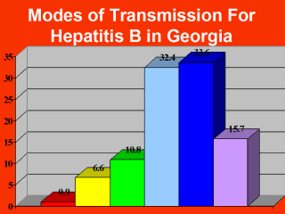 of blood and its products 6.6% - close household contacts 10.8% - iatrogenic (except transfusion of blood and its products) 32.4% - sexual contacts 33.6% - IV drug addiction 15.7% - unknown The data are from Dr. Marina Kvitashvili's doctoral thesis (dissertation) and is based on information collected from 300 patients with newly diagnosed Hepatitis B infection during 1997-99 (Georgian Research Center of AIDS and Clinical Immunology, Center for Infectious Pathology). |