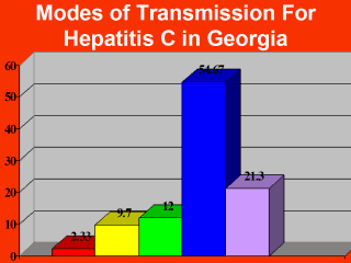 transfusion of blood and its products 9.7% - sexual and close household contacts 12% - iatrogenic (except transfusion of blood and its products) 54.67% - IV drug addiction 21.3% - unknown The source of data is the same as for Hepatitis B and based on information collected from 300 patients with newly diagnosed Hepatitis C infection in 1999. |
