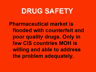 into the country. It is not uncommon that the stories about fake or poor quality drugs hit the headlines almost in every FSU country, like a story about a counterfeit Rocephin (Ceftriaxone) in Georgia. The Russian Ministry's of Health website gives a regular update on counterfeit and poor quality medicines, but not all ministries of health in other FSU countries do the same. Uncertainty about the quality of drugs is one factor, which promotes doctors to prescribe new (and usually more expensive) drugs - they think that when the drug is new, the forgers have not enough time to produce a counterfeit. |