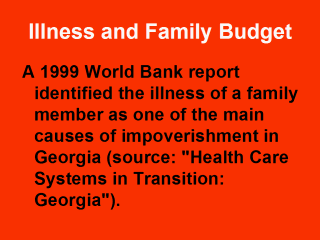 Here is a case history from a joint document of MSF Spain, ECHO and Georgian Ministry of Health "A Manual on Implementing Primary Health Care in Georgia"(1998): a 60-year old internally displaced man with recent stroke. He and his family were forced to sell the apartment in order to cover treatment costs. He underwent treatment with several nonessential drugs, which cost him about 542$. There is no proof that any of them is useful for the condition he had. According to 2004 World Bank report (http://econ.worldbank.org/files/30036_ch8.pdf), 45% of rural patients in Kyrgyzstan sell assets to finance health care. |