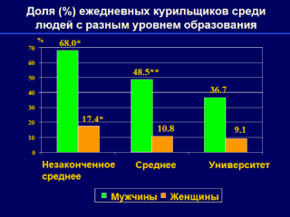 сравнении со средним и университетским образованием **p<0.05, при сравнении с незаконченным средним и университетским образованием |